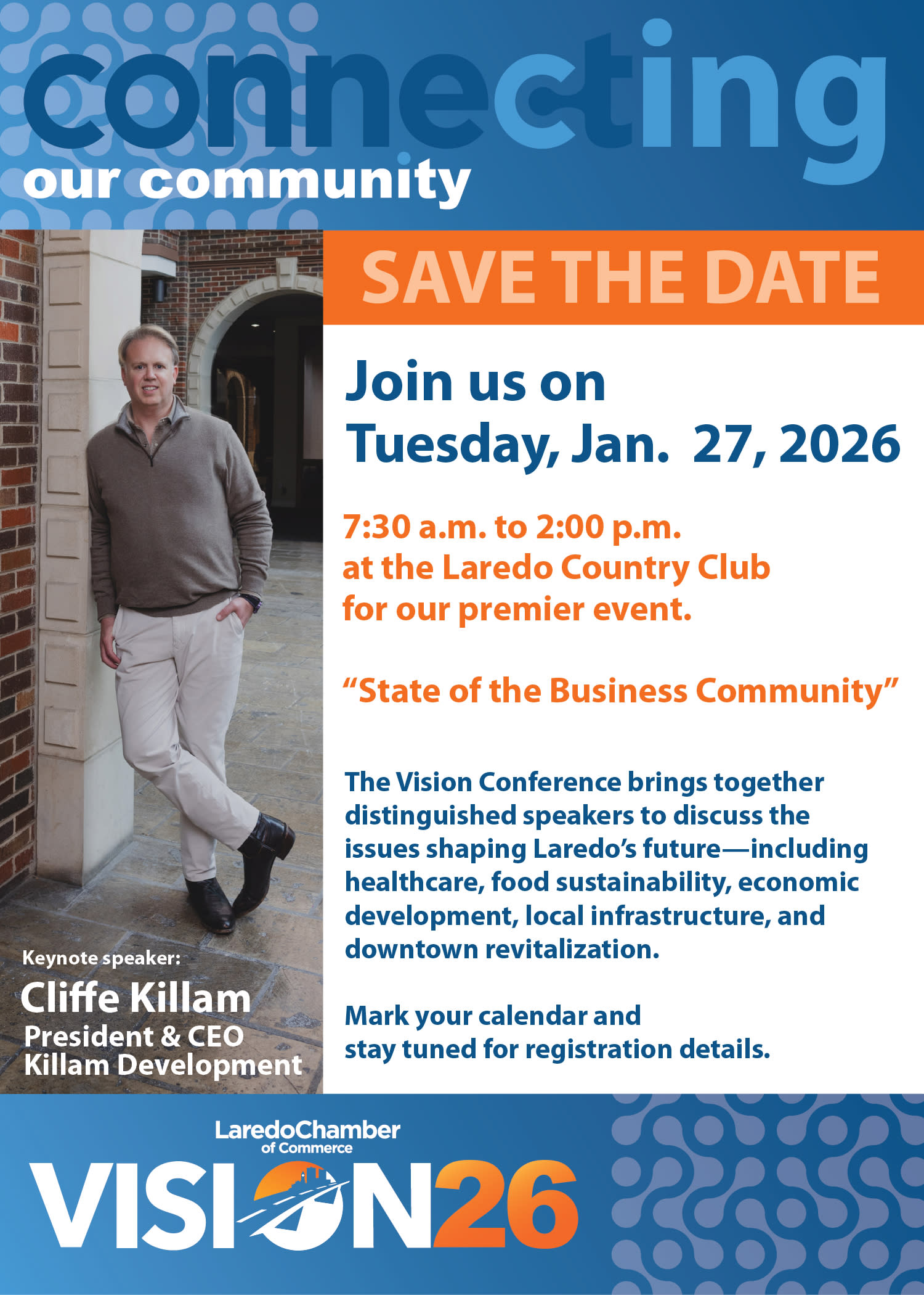The Vision 2026 Conference titled, "State of the Business Community", brings together distinguished speakers to discuss the issues shaping Laredo’s future—including healthcare, food sustainability, economic development, local infrastructure, and downtown revitalization. We are honored to have Cliffe Killam serve as the keynote speaker for this year's conference.